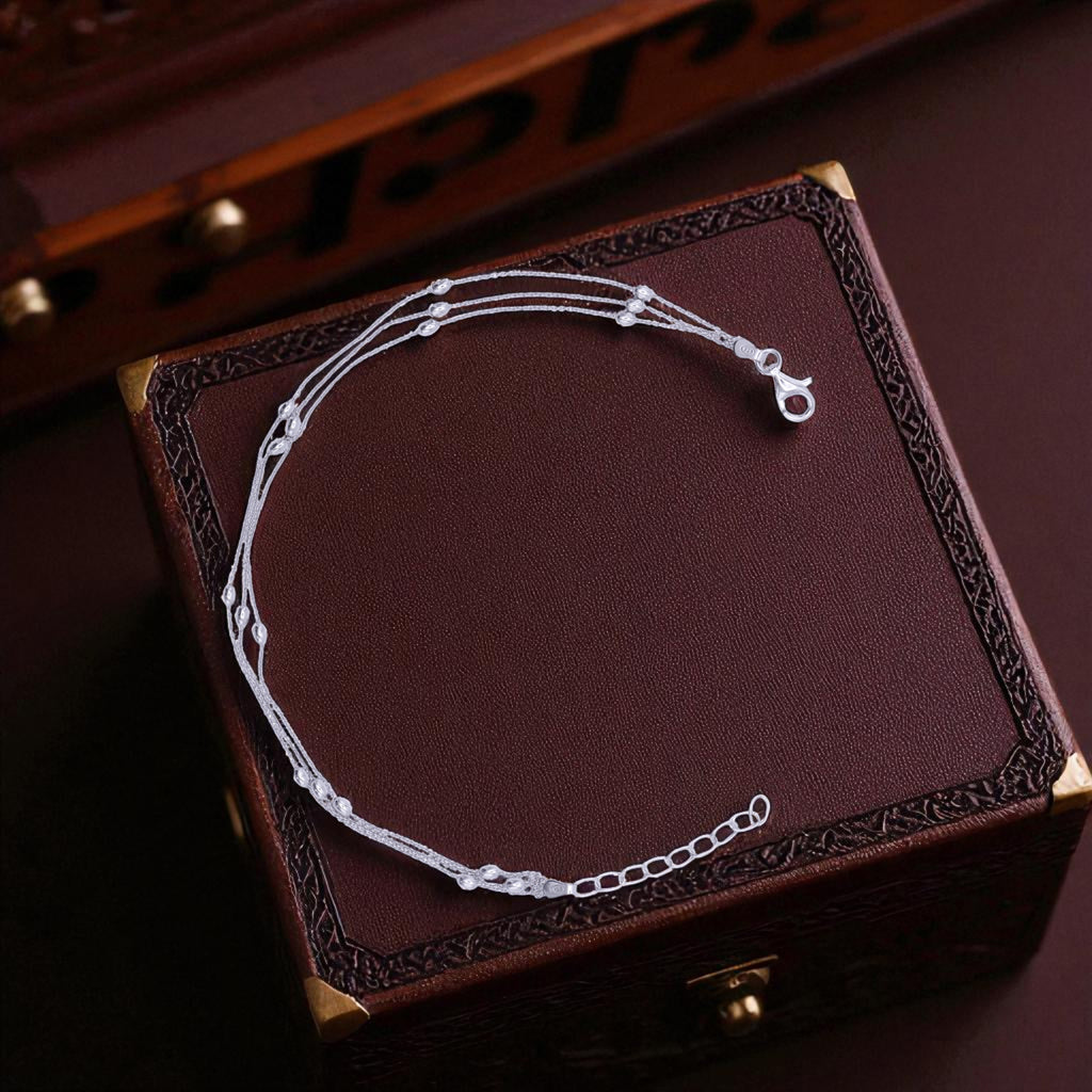 Crafted from premium 925 sterling silver, this anklet showcases a unique, minimalist pattern that captures light and attention with every step. Triple chain anklet with great refined quality. Perfect for daily wear or special occasions, it's a stylish expression of self—lightweight payal.
