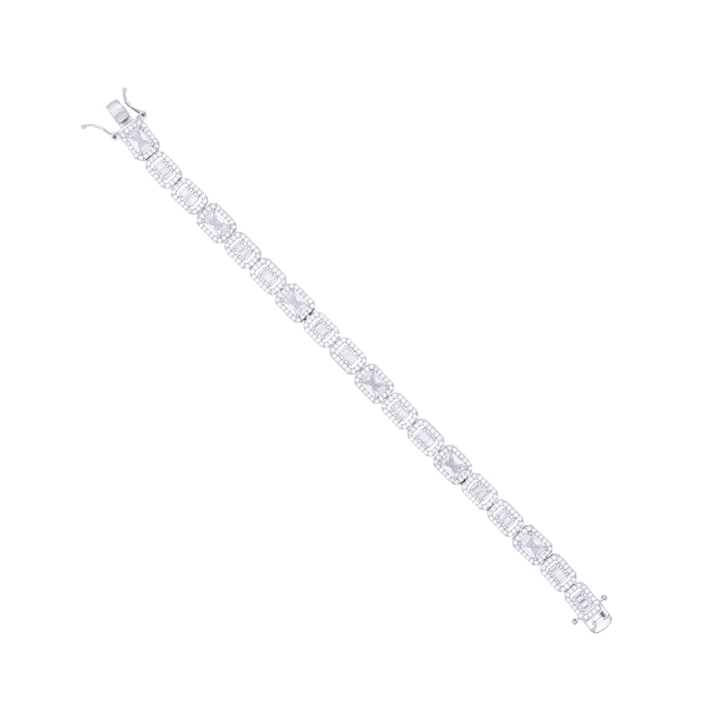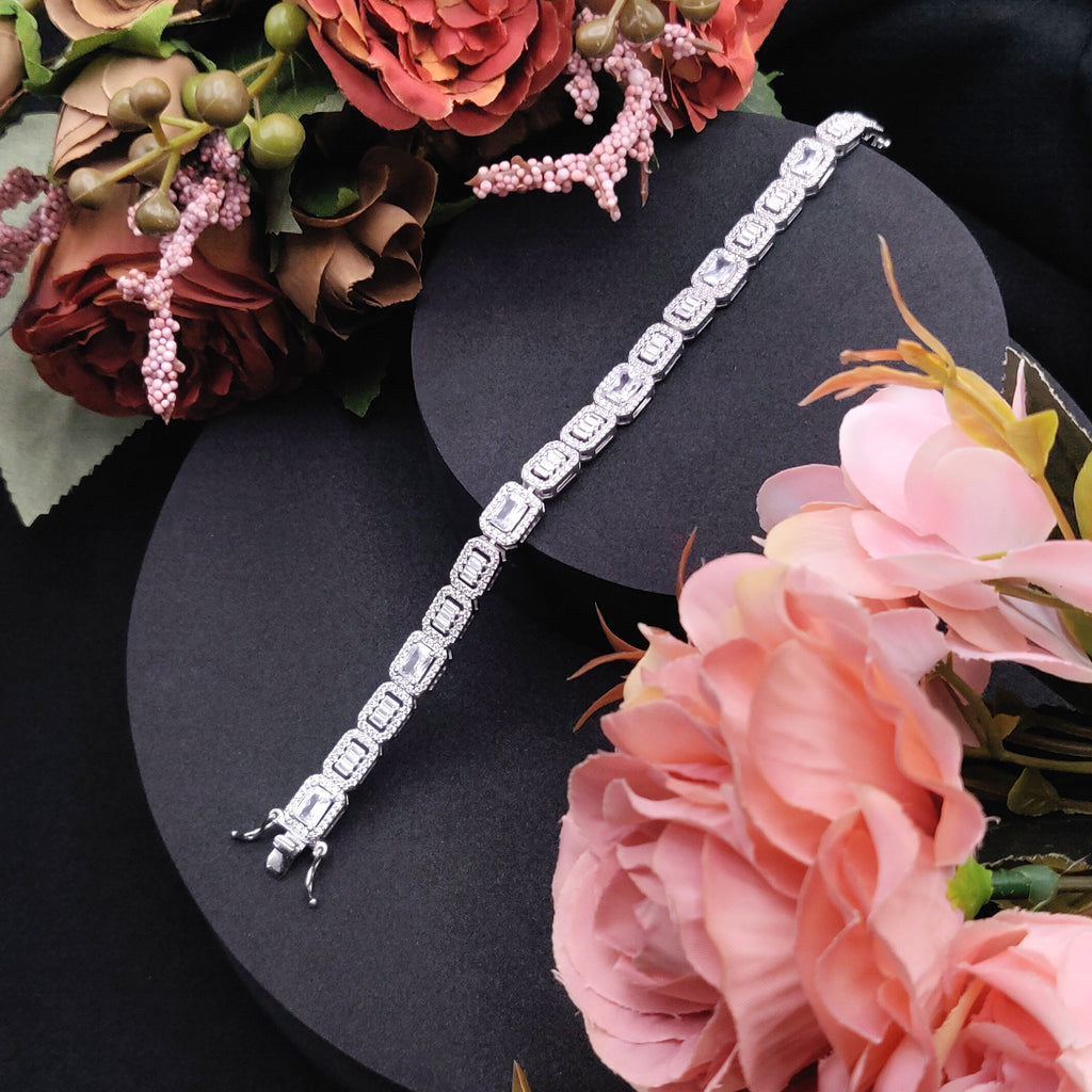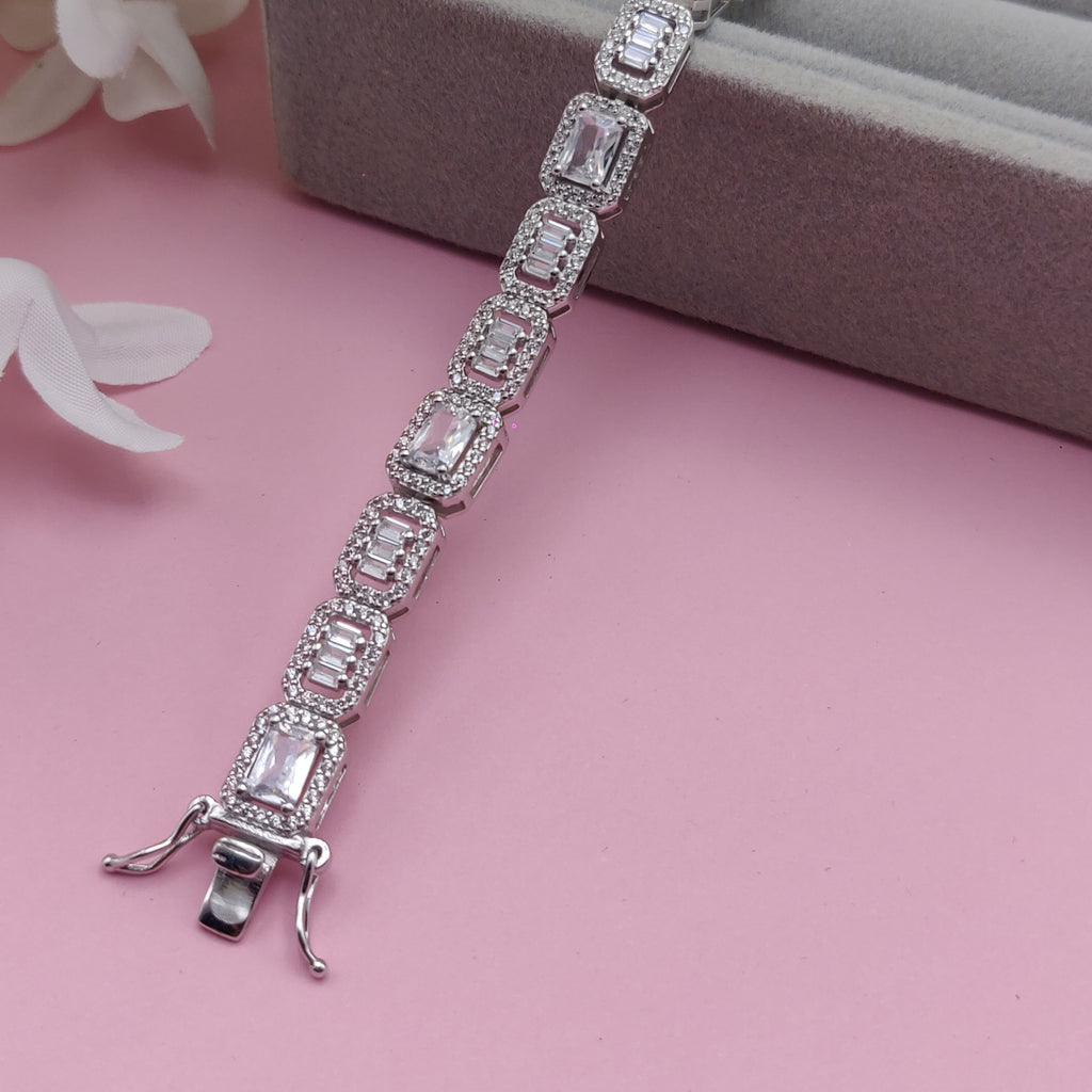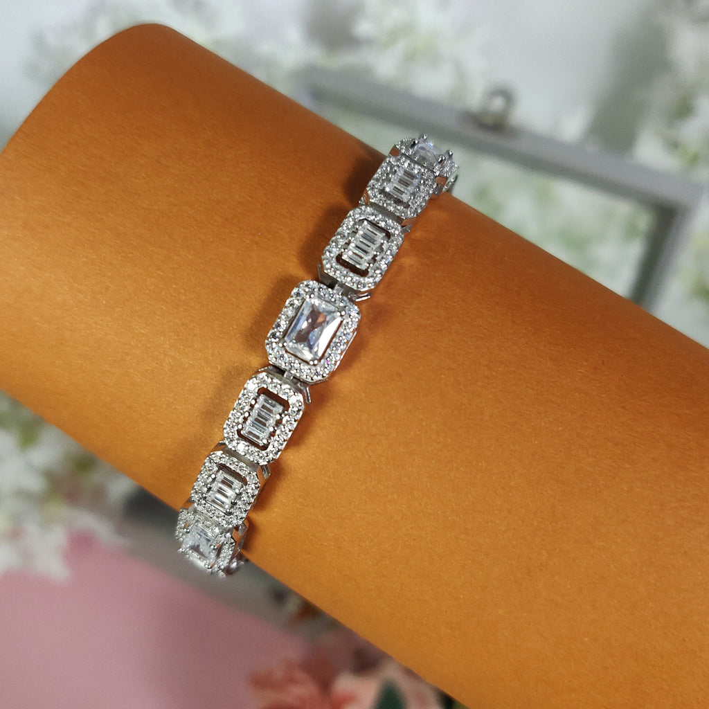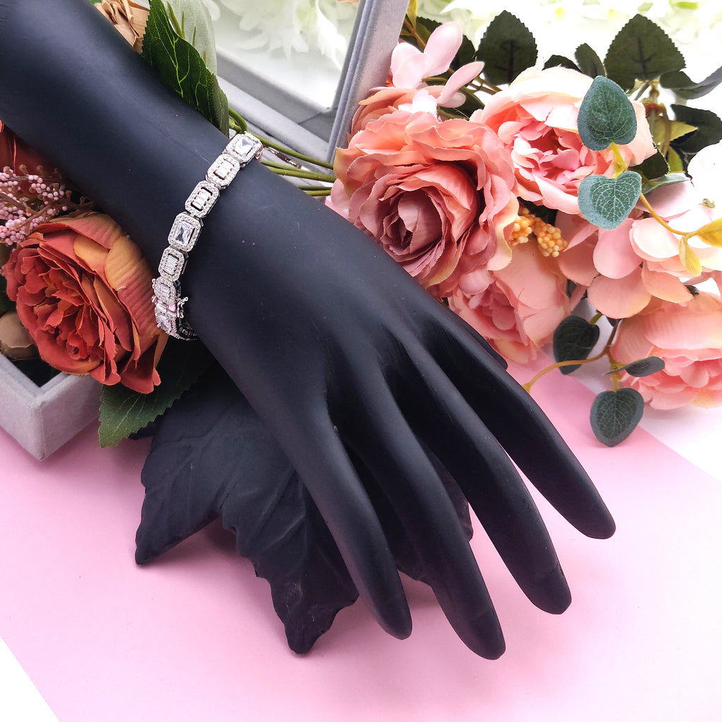 Design: A Pure silver crystal bracelet is created with rectangular-shaped zircon stones, pure zircon crystal with sparkling stone shine. This lovely bracelet has a nice finish of an open box clasp.