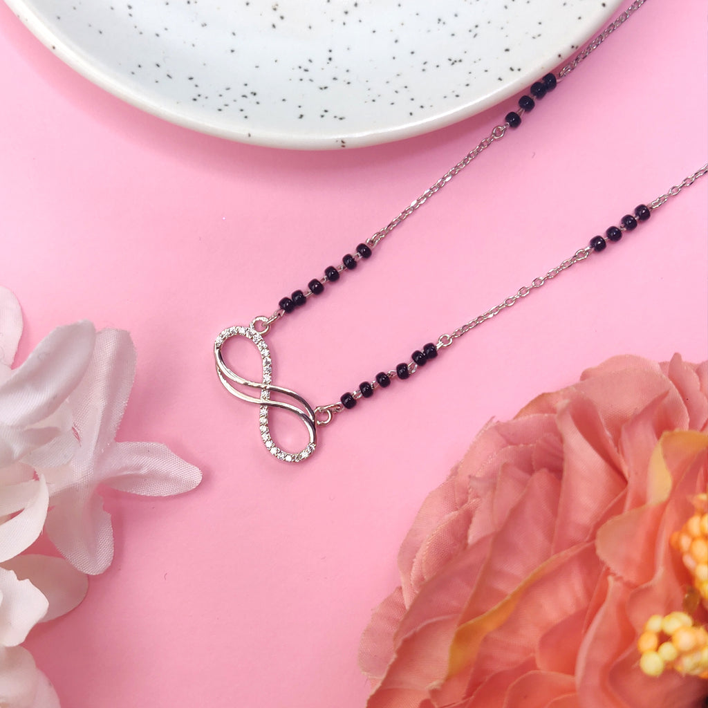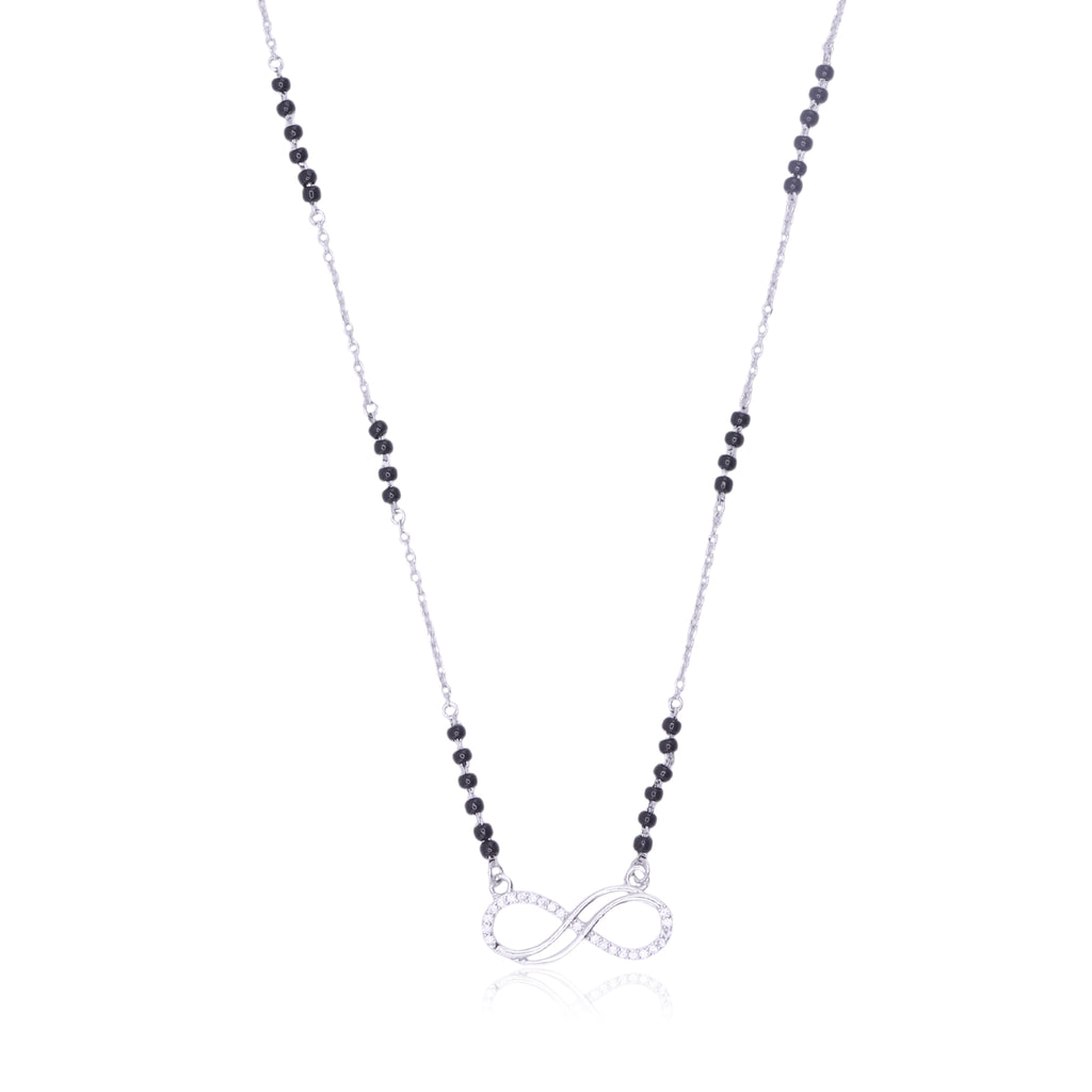 Celebrate eternal love with this Sterling Silver Infinity Black Mangalsutra. Crafted from high-quality 925 sterling silver, it features the timeless infinity symbol paired with traditional black beads, symbolizing protection and endless commitment. Lightweight and comfortable, this mangalsutra is perfect for everyday wear or special occasions, blending modern elegance with cultural significance.