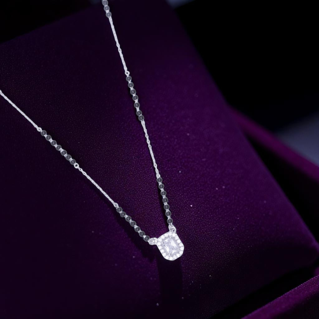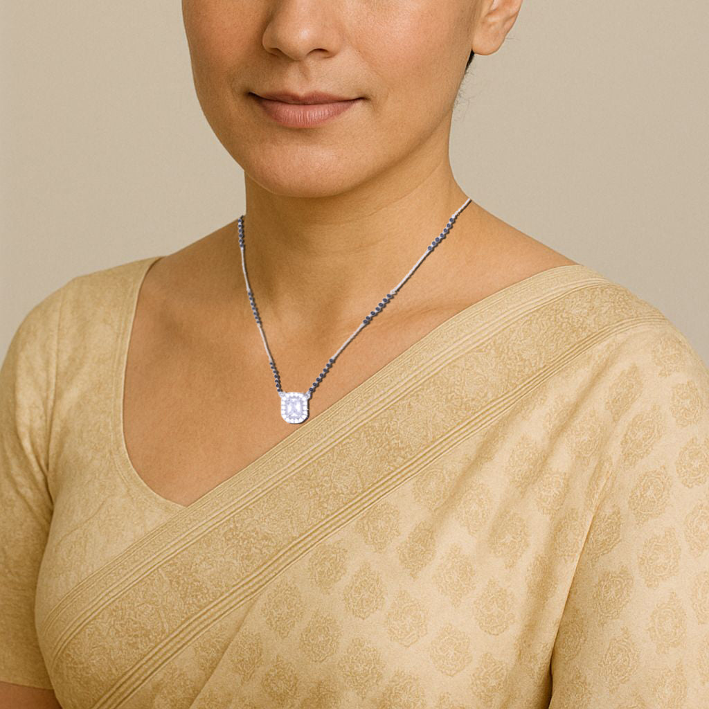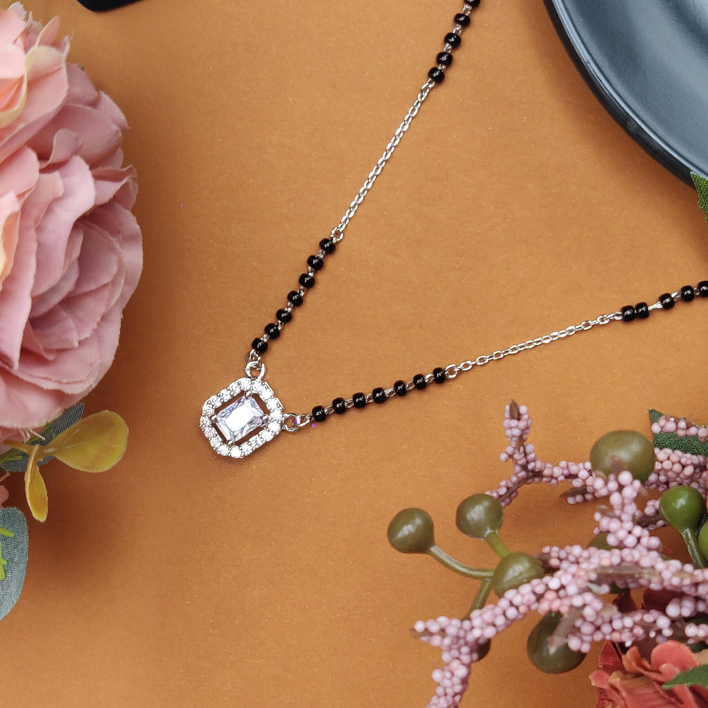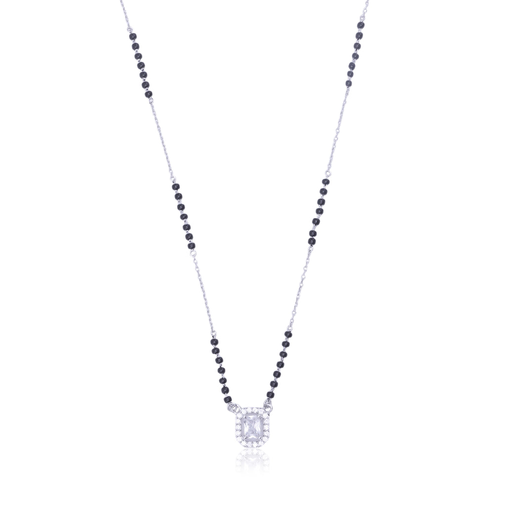 A sleek silver chain with traditional black beads is paired with a finely cut zircon-studded pendant, designed to catch the light and draw attention. The balance of shine and simplicity makes it a versatile piece for every wardrobe.